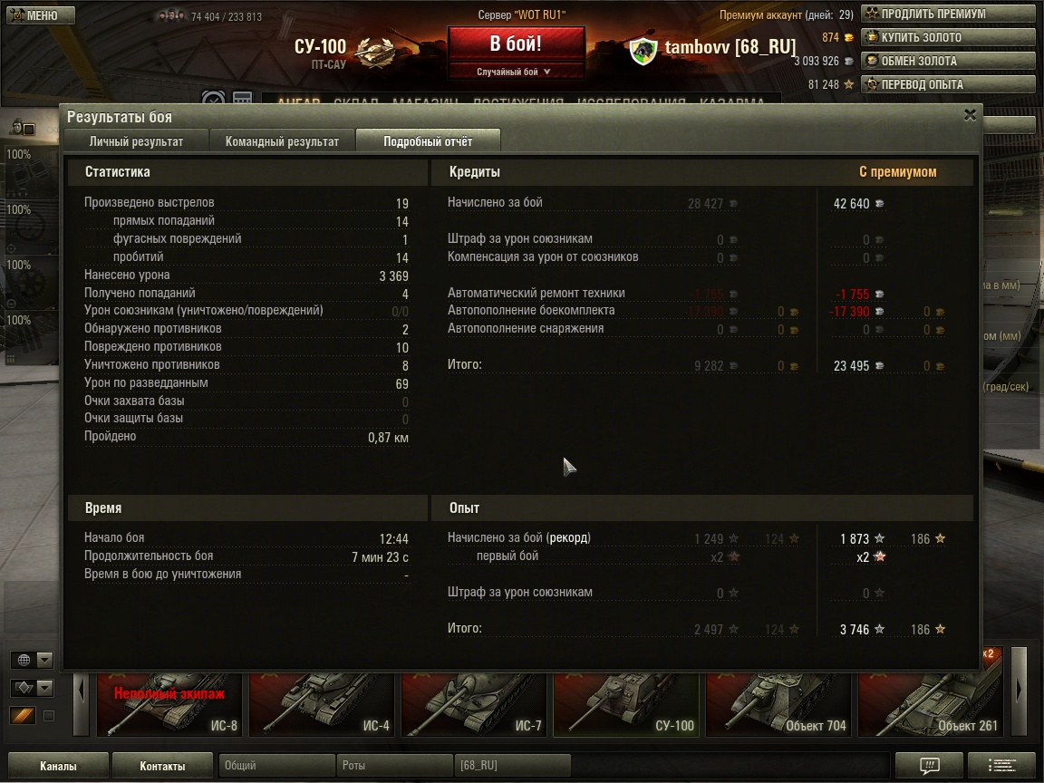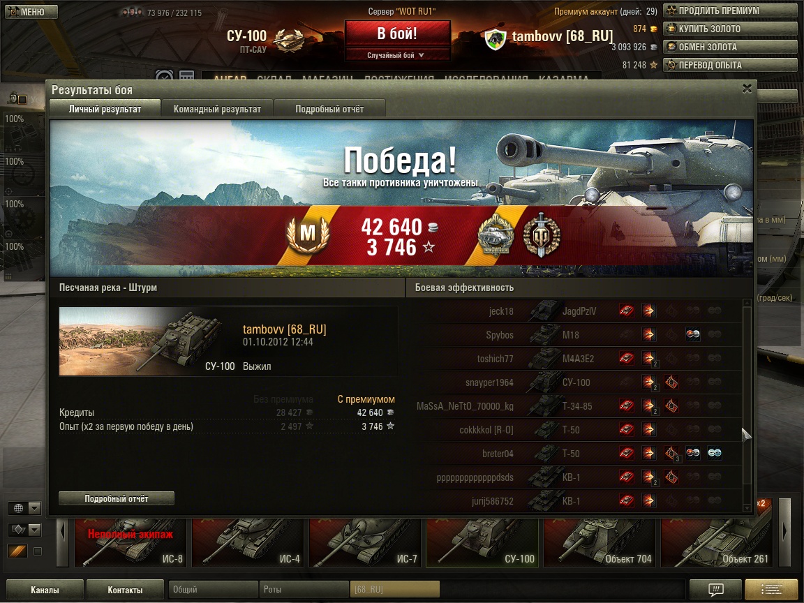 | обеда! Бой: Песчаная река 1 октября 2012 г. 12:44:44 Танк: СУ-100 Получено опыта: 3 746 (x2 за первую победу в день) Получено кредитов: 42 640 Достижения в бою: Медаль Рэдли-Уолтерса, «Воин», Знак класcности «Мастер»