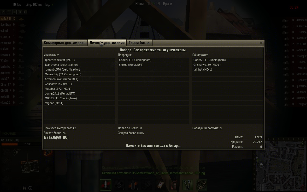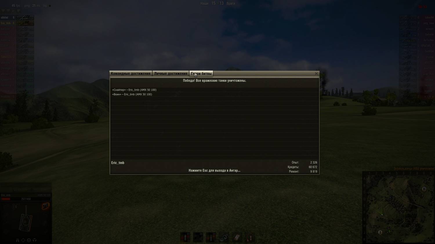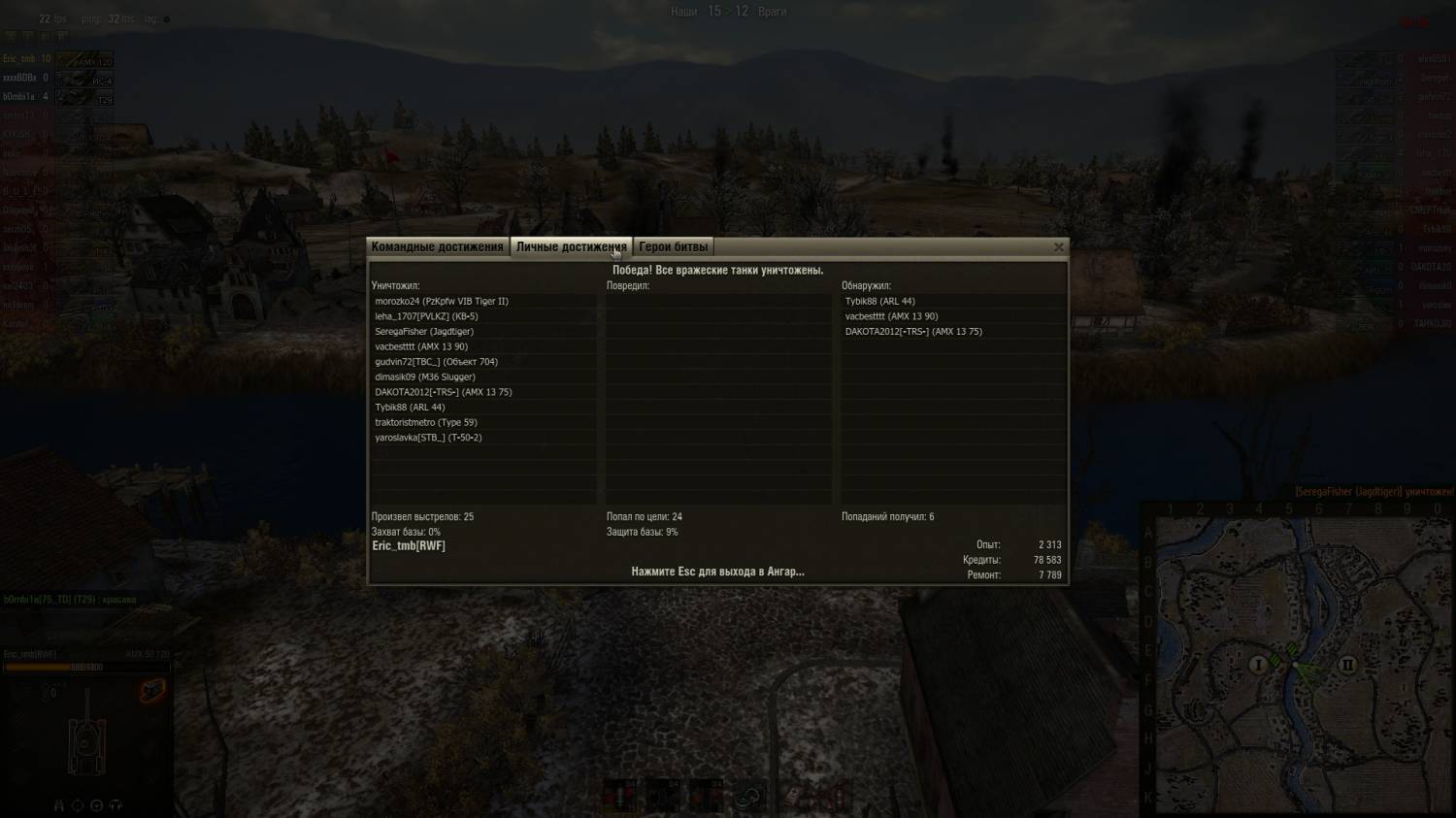 Победа! Бой: Руинберг 23 июня 2012 г. 16:04:12 Танк: AMX 12t Получено опыта: 3 960 (x3 за первую победу в день) Получено кредитов: 26 823 Достижения в бою: «Воин», «Снайпер», Знак класcности «1 степень»