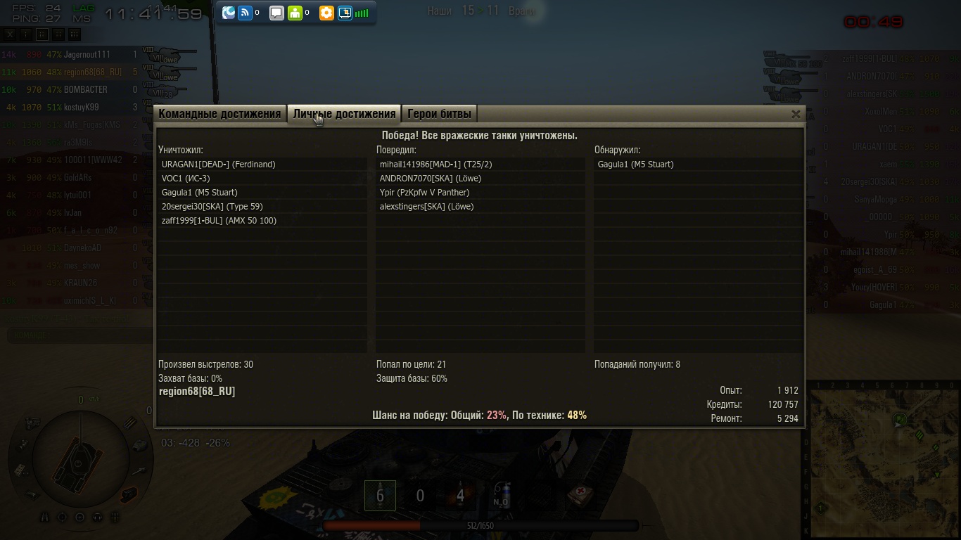 | Победа! Бой: Аэродром 19 июня 2012 г. 21:03:39 Танк: PzKpfw VIB Tiger II Получено опыта: 1 984 Получено кредитов: 60 979 Достижения в бою: Медаль Бёльтера, «Стальная cтена», «Воин», Знак класcности «Мастер»