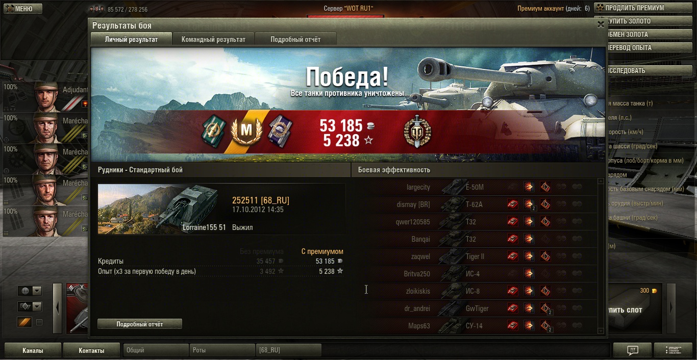 | Победа! Бой: Рудники 17 октября 2012 г. 14:35:14 Танк: Lorraine155 51 Получено опыта: 5 238 (x3 за первую победу в день) Получено кредитов: 53 185 Достижения в бою: «Воин», «Стрелок», «Бронебойщик», Знак класcности «Мастер»
